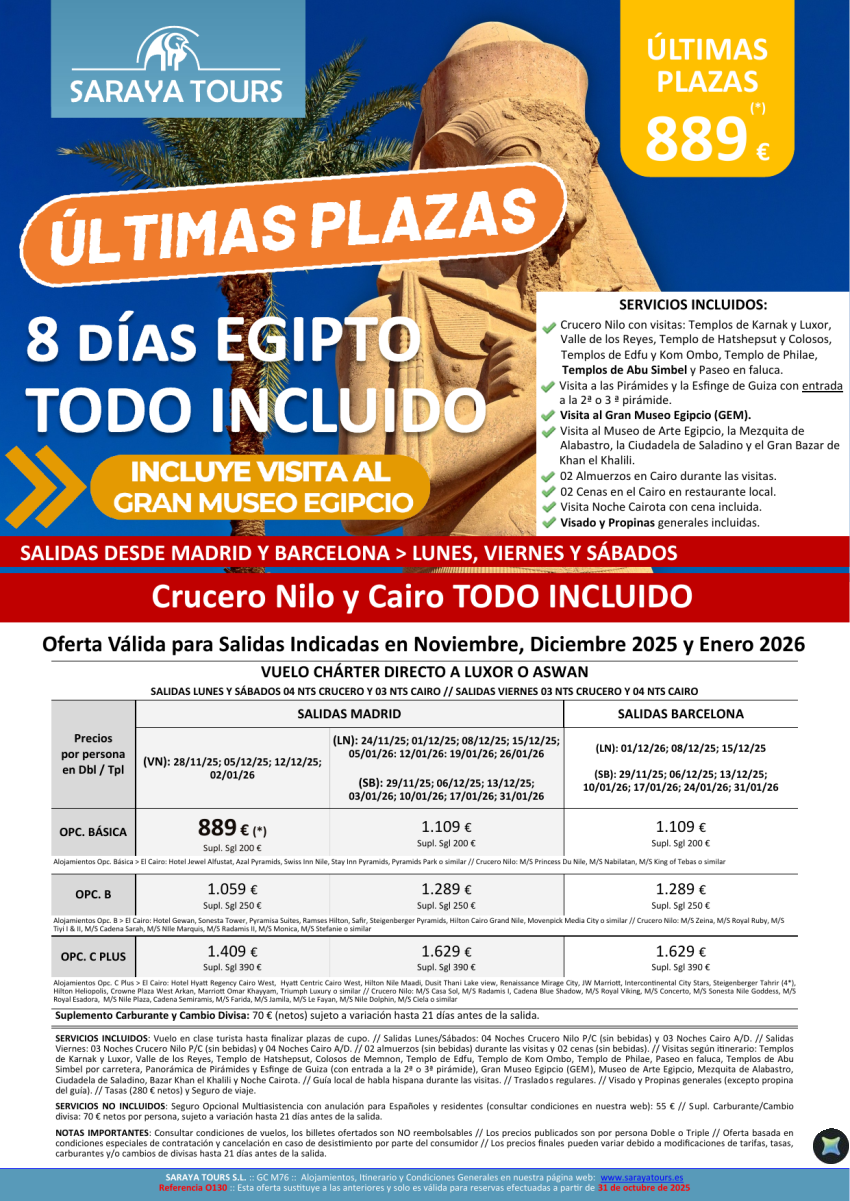 Últimas Plazas Egipto Todo Incluido dsd 889€ con Visitas Incluidas! Salidas Nov, Dic 25 y Ene26 dsd Mad & Bcn